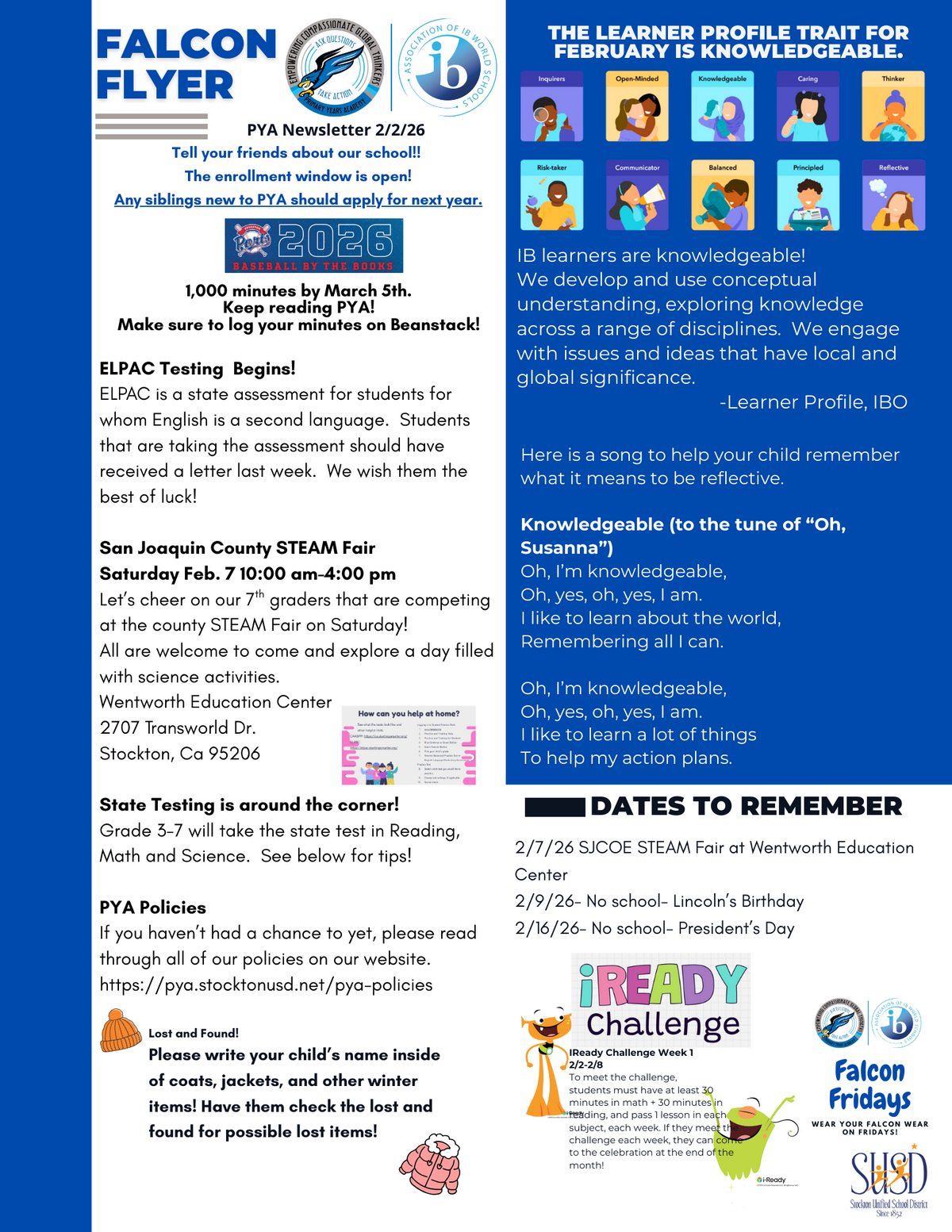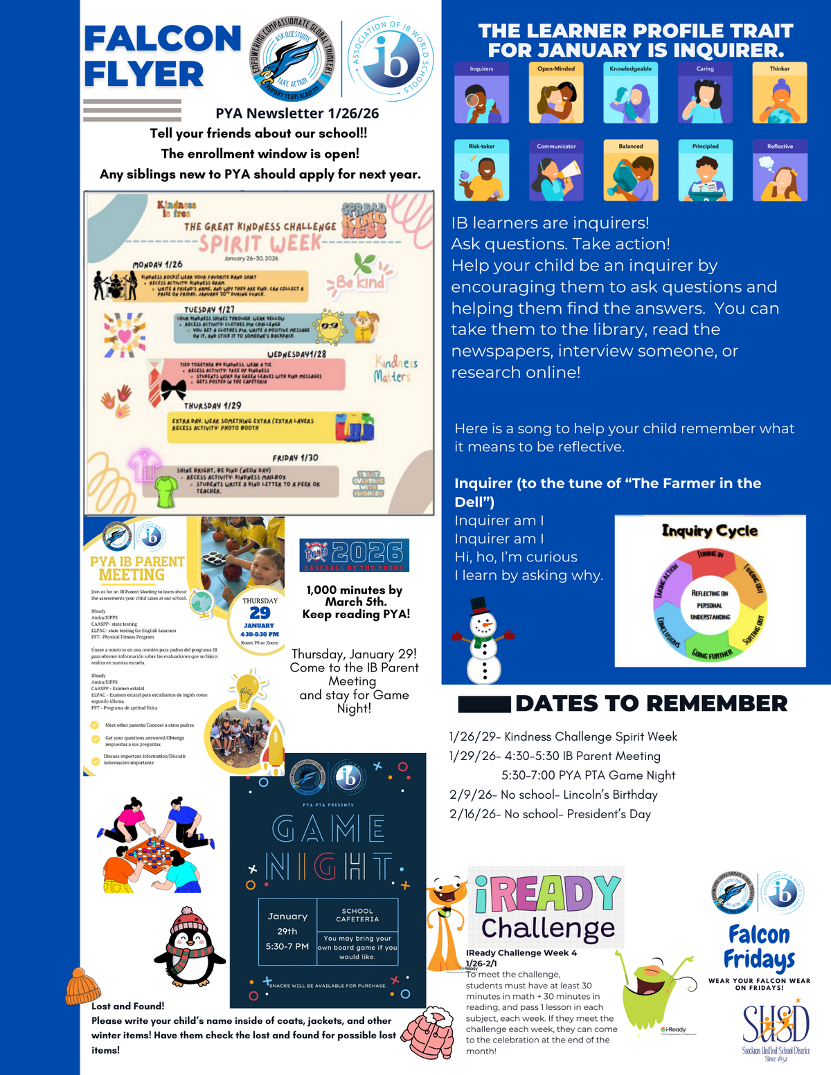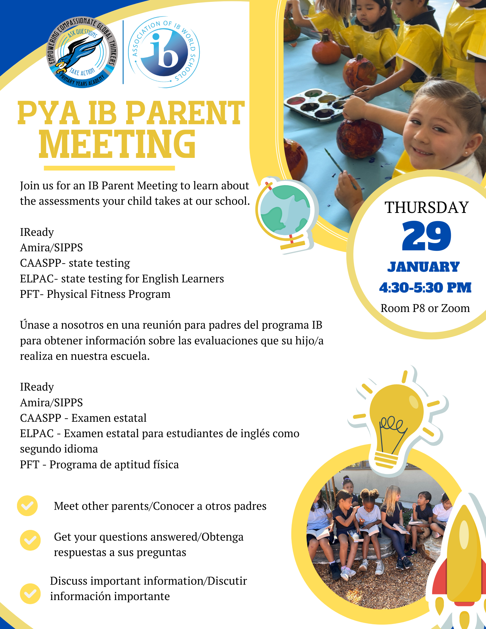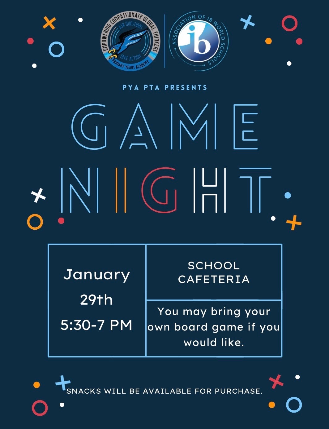 [Tuesday, Jan 27 at 10:40 AM]This Thursday- IB Parent Meeting 4:30-5:30PYA PTA Game Night 5:30-7:00Bring a board game to play with your friends.